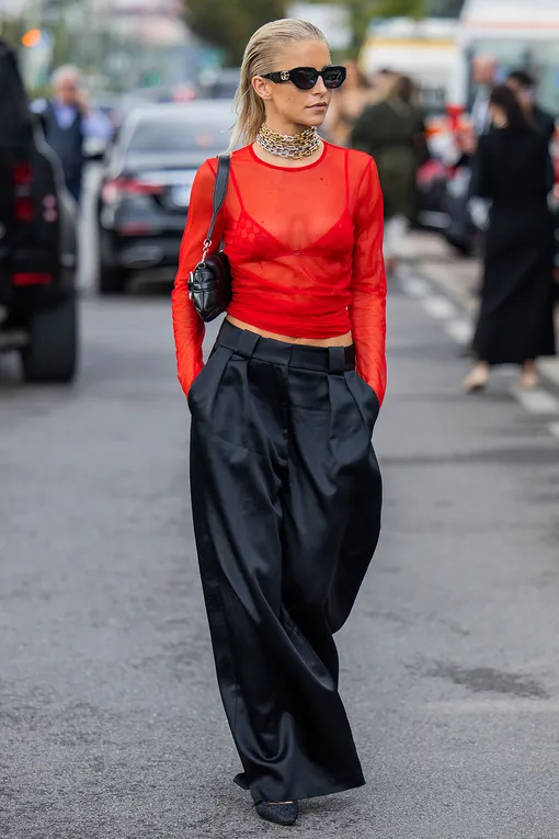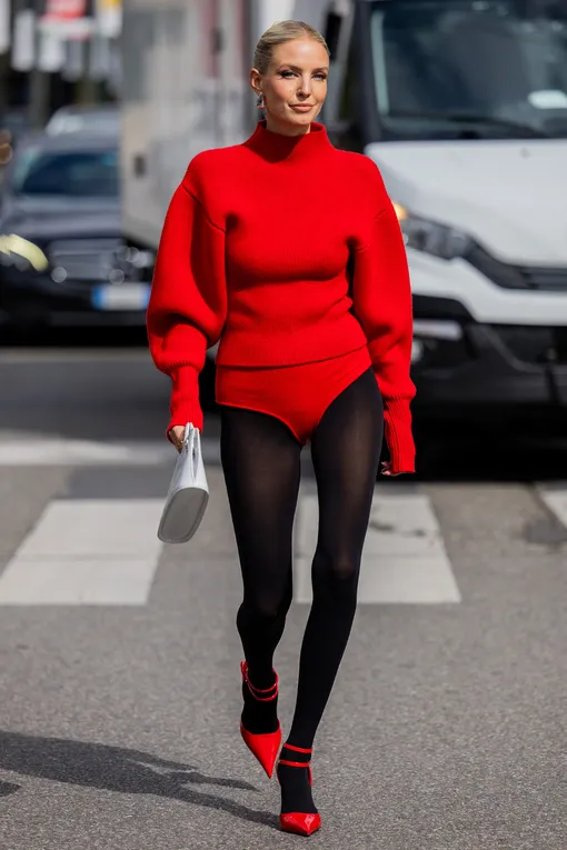 Красный — без сомнений, главный тренд зимы-2024. И на блондинках он смотрится потрясающе. Он подчеркивает оттенок волос и выгодно оттеняет кожу. Алый, гранатовый, бордо или рубиновый — выбирайте на свой вкус, ведь все эти оттенки в тренде. В красном платье можно отправиться на корпоратив или новогоднюю вечеринку. А в повседневной жизни составляйте тотал-луки. Если это пока не для вас, то можно ограничиться одним элементом. Например, свитером. Модель этого оттенка подойдет и в пир, и в мир. Такой свитер можно носить с джинсами, мешковатыми брюками или юбками разной длины.