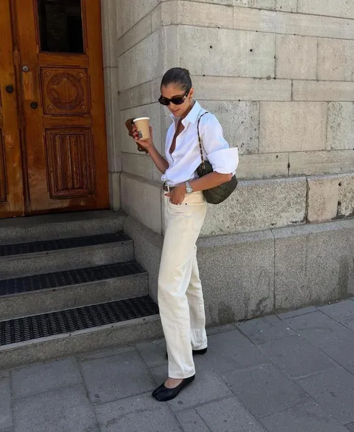 Особенный шик — это умение сочетать разные оттенки белого в одном образе. Не верьте стилистам, которые утверждают, что делать этого нельзя: кипенно-белый и кремовый (или, скажем, цвет яичной скорлупы) отлично смотрятся вместе. Просто взгляните на этот лук: кремовые брюки отлично оттеняют белоснежную сорочку «мужского» кроя, а минималистичные черные аксессуары завершают образ.