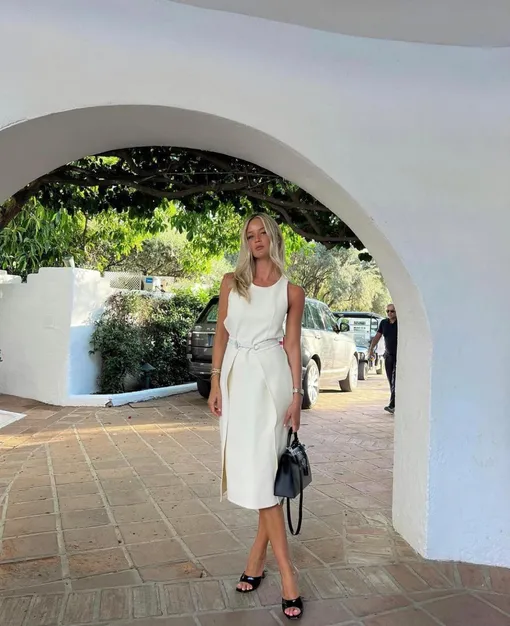 Светлые оттенки вообще лучше всего вписываются в концепцию old money aesthetic: они отлично передают свойственный этой эстетике дух безмятежности и спокойствия. А еще непрактичные, но очень эффектные цвета автоматически добавляют образу того шика, который не могут обеспечить темные тона. Белое платье длины миди — квинтэссенция этого настроения. Дополните его аккуратной небольшой сумкой и мюлями на невысоком каблуке — и вы готовы к вечернему променаду.