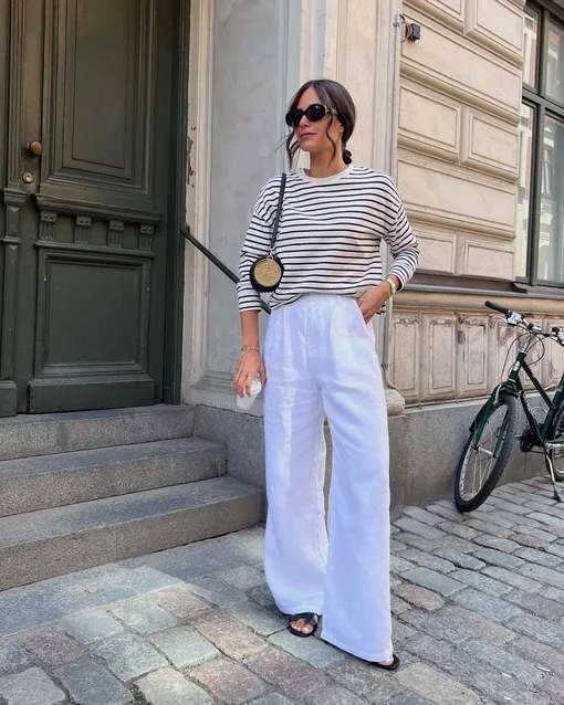 Тельняшка — бесспорная летняя классика. Именно в ней проще всего ощутить себя Брижит Бардо, прогуливающейся где-нибудь на Лазурном побережье. Для полного эффекта расслабленного шика дополните ее белоснежными широкими брюками изо льна. Этот материал неспроста называют «летним кашемиром»: он смотрится так же благородно, но при этом обладает способностью охлаждать температуру тела даже в самый жаркий день.