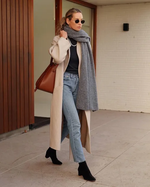 Идеальное комбо для тех, кому за день необходимо успеть в тысячу разных мест и везде выглядеть уместно. Пара прямых джинсов на высокой посадке не только сочетается с любым верхом, но и отлично садится на любую фигуру, удлиняя ноги и скрывая живот. Дополните образ удобными ботильонами и вместительной сумкой. Для тепла можно повязать на шею объемный шерстяной шарф.