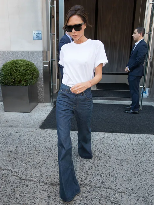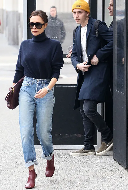 «Мамские» модели с высокой талией и прямым кроем вот уже несколько сезонов не покидают гардеробные главных модниц планеты, и Виктория — один из главных адептов и поклонниц этой модели. Она носит mom-джинсы с прозрачными блузами, черными водолазками и мужскими футболками и скупает все модели от нежно-голубого до насыщенного индиго и navy blue.