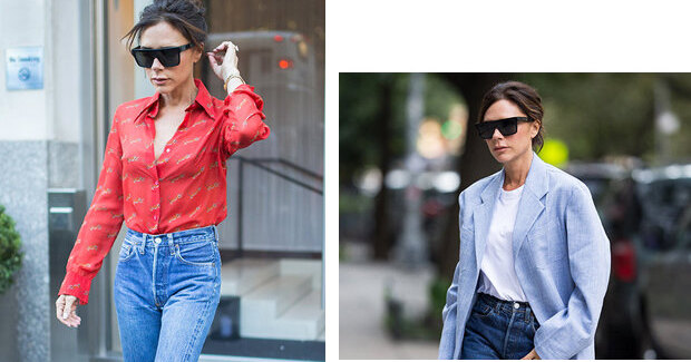«Мамские» модели с высокой талией и прямым кроем вот уже несколько сезонов не покидают гардеробные главных модниц планеты, и Виктория — один из главных адептов и поклонниц этой модели. Она носит mom-джинсы с прозрачными блузами, черными водолазками и мужскими футболками и скупает все модели от нежно-голубого до насыщенного индиго и navy blue.