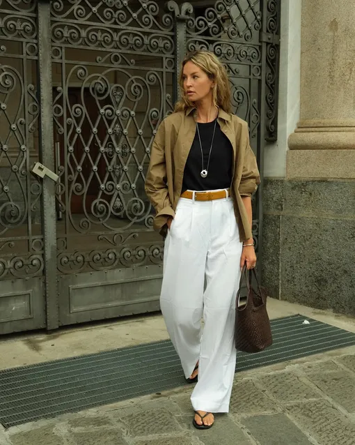 Дилемма какие брюки выбрать на лето решается по‑разному: кто‑то делает ставку на струящийся атлас, кто‑то на практичный черный, кто‑то на невесомый лен. Но именно белые хлопковые брюки уверенно занимают центральное место. Одним словом — классика, которую никогда не помешает обновить. Лучшей инвестицией станут свободные прямые варианты или клеш. Еще одно хорошее решение — брюки-палаццо. Свободные опции — настоящее спасение на каждый день, и идут они абсолютно всем. Посадка — завышенная, средняя или низкая. Ориентируйтесь на свои предпочтения и тип фигуры.