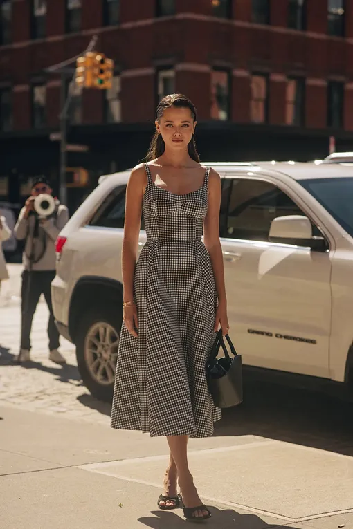 Если все вышеперечисленные варианты в вашем гардеробе уже есть, рекомендуем присмотреться еще к одному — приталенному миди с пышной юбкой. Такое платье смотрится одновременно строго и женственно, выгодно подчеркивает фигуру, а еще — подходит для самых разных случаев. Этот крой достоин гардеробов юных Софи Лорен и Брижит Бардо — и он снова в моде этим летом. Носите такое платье с мюлями на аккуратной шпильке или минималистичными кожаными шлепанцами.