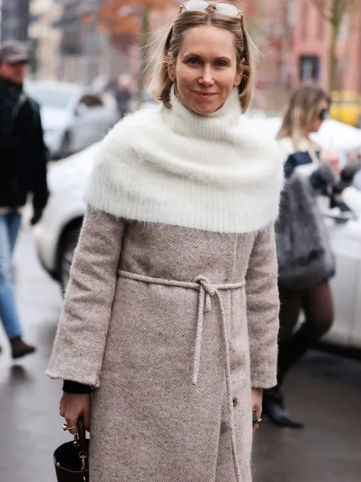 Аксессуары зимой выходят на первый план. Шапки, капоры, балаклавы, шарфы и даже горжетки давно стали частью повседневных луков. Еще один выразительный прием — шерстяная манишка, надетая поверх пальто. Этот ход добавляет фактуры и делает ансамбль визуально сложнее, не жертвуя нашим комфортом.