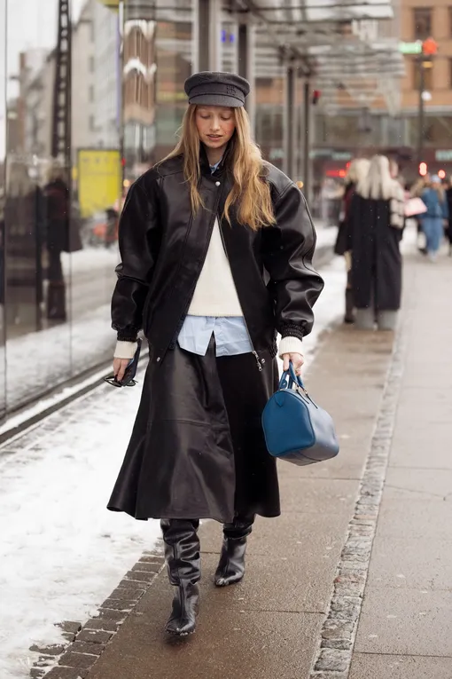 Кожа уверенно удерживает позицию самого универсального материала сезона. И лучший способ носить ее — в формате тотал-лука. Попробуйте юбку А-силуэта в длине миди в паре с утепленным кожаным бомбером. Под него — рубашка и джемпер для многослойности. Завершите образ высокими сапогами и кепи.
