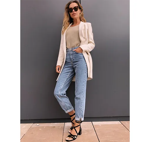 Джинсы-бойфренды можно дополнить обувью на небольшом каблуке и жакетом для более романтичного образа на вечер.