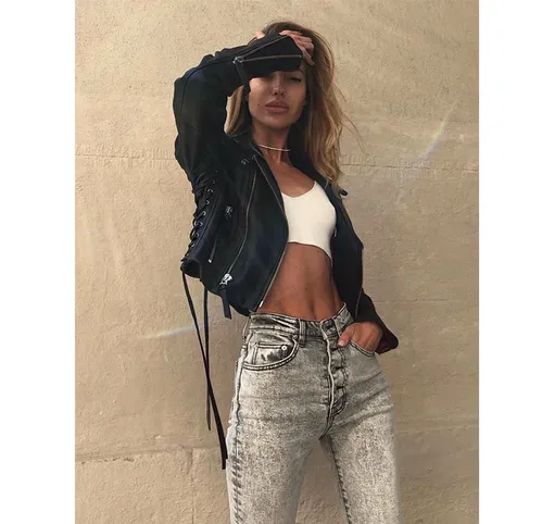 Джинсы скинни люблю носить с коротким топом и косухой, удобно и в то же время очень стильно.
