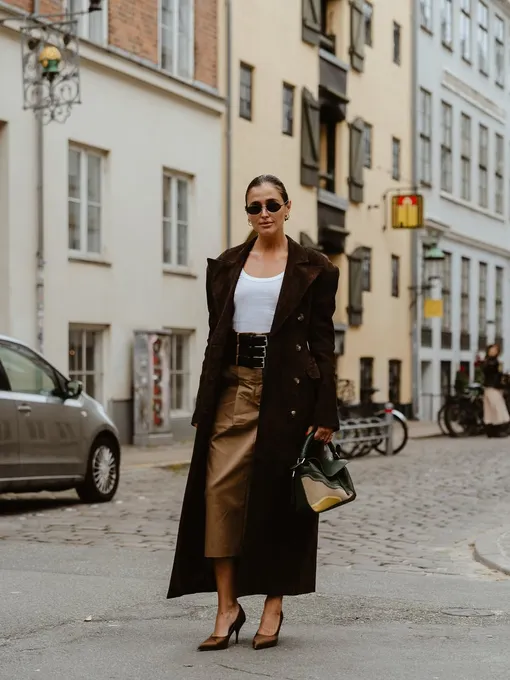 Возьмите свободную рубашку шоколадного оттенка и заправьте ее в юбку миди в молочном цвете. Сделайте ставку на мюли на танкетке — это и визуально удлинит силуэт, и добавит комфорта. Важно: танкетка — не пережиток 2000-х, а модный и практичный элемент образа, возвращающийся в тренды этой осенью.