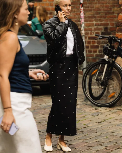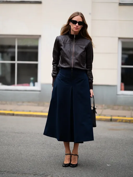 «Верх» — головная боль переходного сезона. Но у скандинавок есть готовое решение: легкая кожаная куртка в комбинации с миди-юбкой. Этот прием помогает добавить маскулинной нотки в лук и сделать его более подходящим к прохладному лету. Лучше всего работают комбо из разных фактур — например, юбка из вискозы или плотного хлопка и куртка из мягкой кожи.