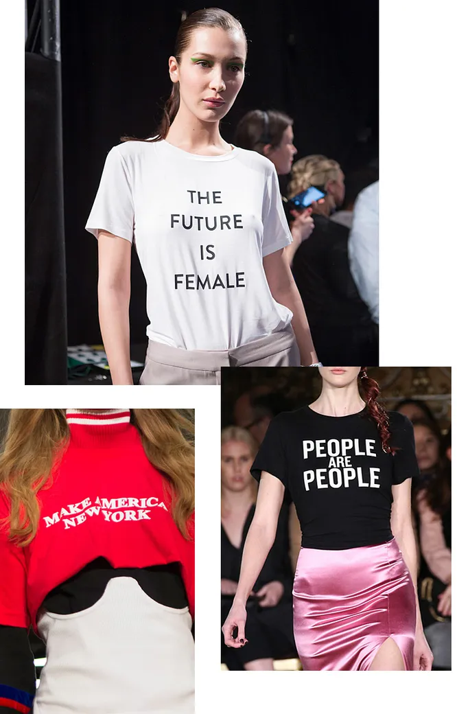 После февральских показов у весенних лозунгов появились альтернативы. Антитрампистская политика объединила всех дизайнеров от Нью-Йорка до Парижа идеей одежды как политического плаката. В тяжелые времена мода просто не может молчать и предлагает написать все, что вы думаете, у себя на одежде. Так, Public School интерпретировали у себя на бейсболках лозунг Make America Great Again, а Донателла Версаче застолбила гордые и звучные Unity, Loyalty, Love, Equal и другие вечные ценности. А главное, чем зрителям запомнился показ новой коллекции Прабалa Гурунга, — это финальный выход моделей, на котором все участницы дефиле появились в белых и черных футболках с феминистскими лозунгами на злободневную для современной Америки тему: The future is female, Yes, we should all be feminists, Girls just want to have fundamental rights и так далее.