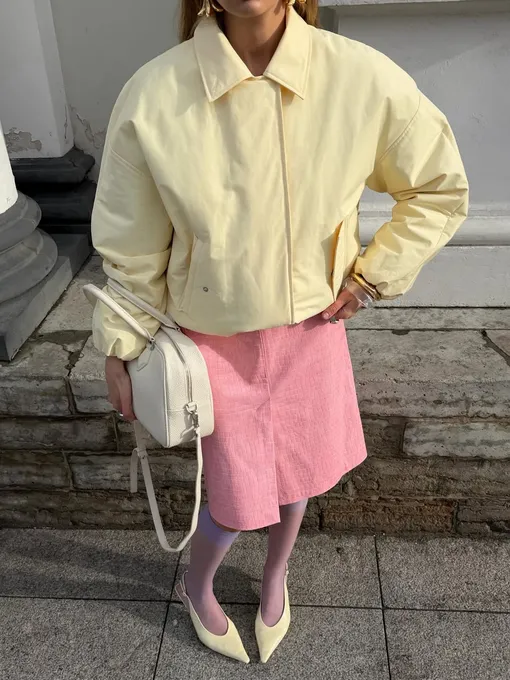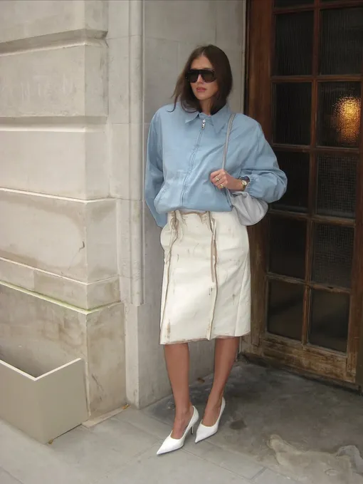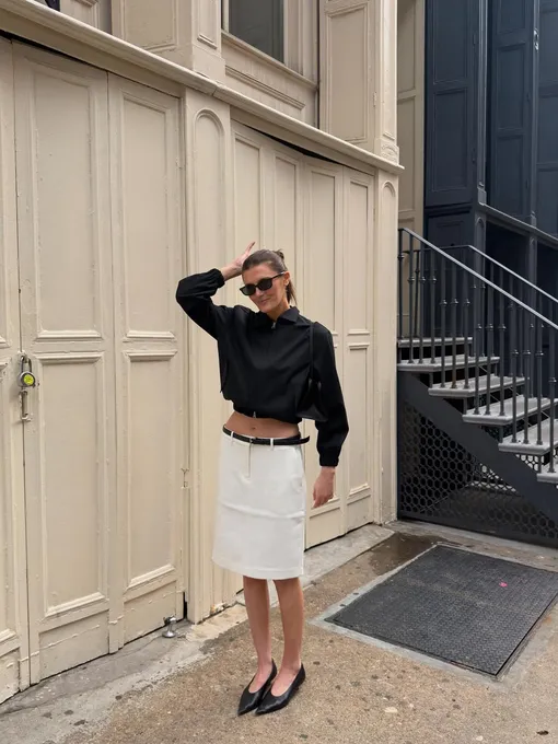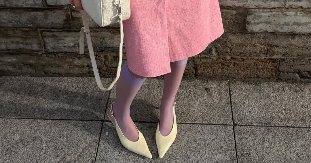 Туфли-слингбэки держат баланс между классикой и легкостью. Открытая пятка, заостренный мыс, аккуратная перемычка — все работает на ваш комфорт и вытянутый силуэт. История этой пары уходит в 1957 год, когда Габриэль Шанель представила свою знаковую двухцветную модель. Сегодня они снова на пике популярности, и с юбкой миди выглядят особенно гармонично. Попробуйте неожиданные сочетания оттенков в луке. Например, нежно-розовая юбка в комбинации со сливочно-желтыми туфлями.