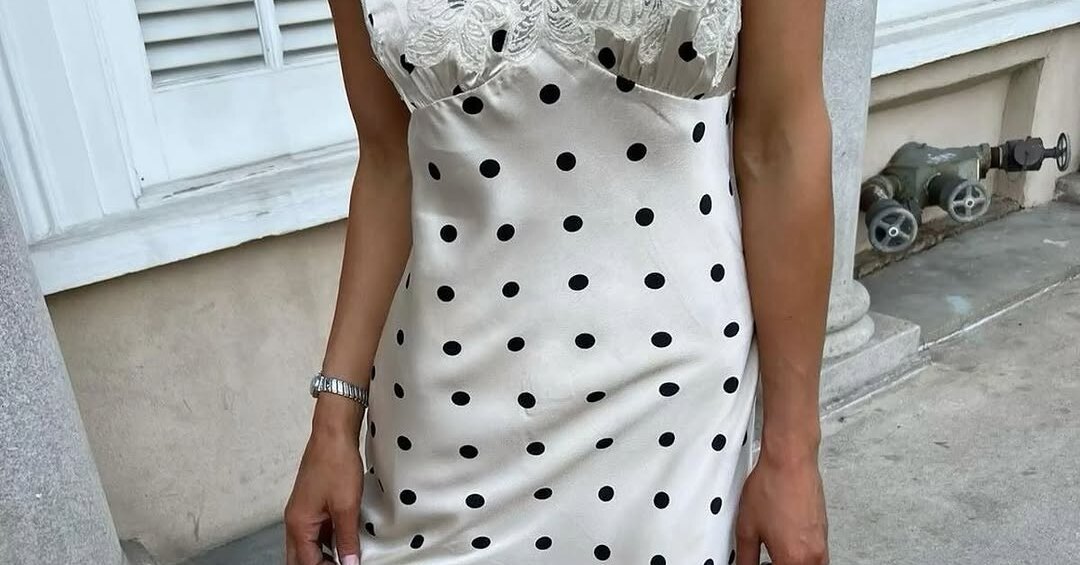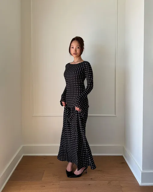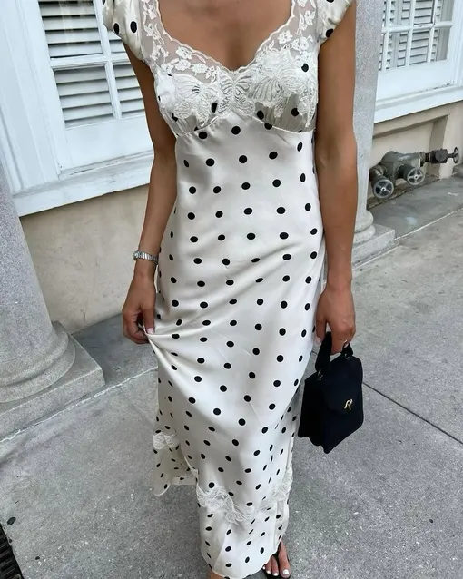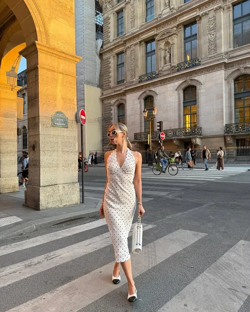 Среди самых популярных платьев в горох, которым отдают предпочтение инфлюенсеры, мы заметили модели с акцентом на талии в духе ladylike и комбинации в бельевом стиле, которые часто украшены кружевом и гипюром на лифе. Еще одна актуальная идея – крой с юбкой-баллоном: они выстрелили прошлым летом и не планируют уходить из топа самой желанной одежды еще несколько сезонов. Также стоит задуматься про вариацию платья доярки или milkmade dress – сейчас они особенно виральны в социальных сетях, а это значит, что эту модель мы точно увидим в ассортиментах российских брендов ближе к наступлению отпускной поры. Классический черно-белый горошек добавит ей утонченной элегатности, а главное лишит образ нежелательной простоты.