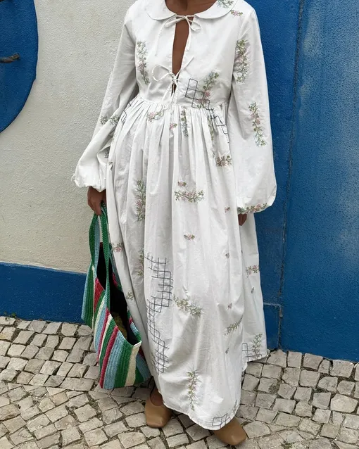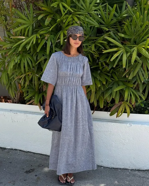 Если говорить о материалах, то избегайте плотных тканей. Лен и хлопок — ваши главные союзники. Цветовая палитра — белый, молочный, все вариации пастельной гаммы (небесно-голубой, мятный, пудрово-розовый или оттенок сливочного масла). Что касается принтов, то присмотритесь к тонкой полоске или цветочным мотивам. Как их стилизовать? Тут все просто: выберите удобную обувь на плоском ходу (сабо, мюли, вьетнамки или сандалии), добавьте сумку из рафии и украшения в морской тематике. Но помните: в этом случае меньше значит больше. Все внимание — к фасону и вашему внутреннему ощущению комфорта. Ну а определиться с выбором вам поможет наша подборка ниже. В ней вас ждут стильные платья с длинными рукавами 2025, которые можно купить прямо сейчас.