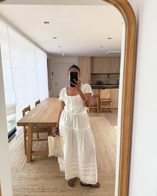 Белое платье в крестьянском стиле — одна их тех вещей, которая не нуждается в дополнительной стилизации. Носить ее можно как в расслабленных образах с вьетнамками, плетеными сумками и шелковым платком, повязанным вокруг головы на манер косынки, так и в строгих комплектах с прямыми пиджаками и босоножками в бохо-стиле, создавая стильный контраст. За нарядность отвечают такие детали как атласные банты, ручная вышивка по подолу изделия и деликатные рюши и ленты, «вплетенные» в ткань. В этом сезоне особенно популярны модели с пышными рукавами и объемными подолами в духе бохо. Однако макси — не единственный возможный вариант. Например, платья А-силуэта в мини-длине или миди с акцентом на талии также могут стать лучшей униформой на жаркий сезон. Главное помнить, что стилизовать их лучше всего с такой же простой обувью — например, сандалиями на шнурках, романтичными тканевыми балетками и мюлями на плоской подошве. А вот про высокие каблуки и грубые ботинки лучше забыть — они никак не сочетаются с летящими тканями и ажурной фактурой.