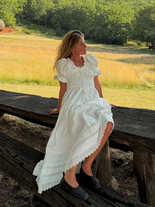 Коттеджкор — все еще самая актуальная эстетика на лето. Благодаря тому, что референсы для идеального платья в этом стиле можно получить из самых разных источников, начиная фильмом Софии Копполы «Мария Антуанетта» и заканчивая лентой соцсетей, где эта стилистика продолжает бить все рекорды по популярности. Например, недавно Pinterest представил очередной отчет о самых виральных запросах пользователей, где почти все пункты, начиная от отпуска в дикой природе, заканчивая пасторальным стилем, включали в себя деревенскую или же крестьянскую эстетику. Коттеджкор тоже можно считать их частью — летящие ткани, хэндмэйд-вышивки, актуальные силуэты юбки-полусолнца, ажурная текстура — все это сохраняет свою популярность уже не первое лето. В случае, если пресловутое платье-молочницы с топом-бюстье уже надоело, всегда можно выбрать модель с рукавами — тем более, что сейчас их стало вдвое больше. Фонарики, буффы, воланы и размахайки — выбирать из этого множества фасонов можно бесконечно.