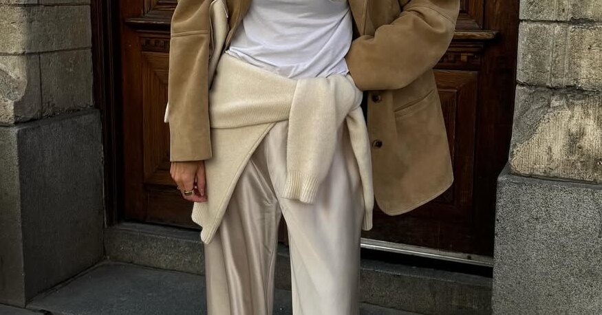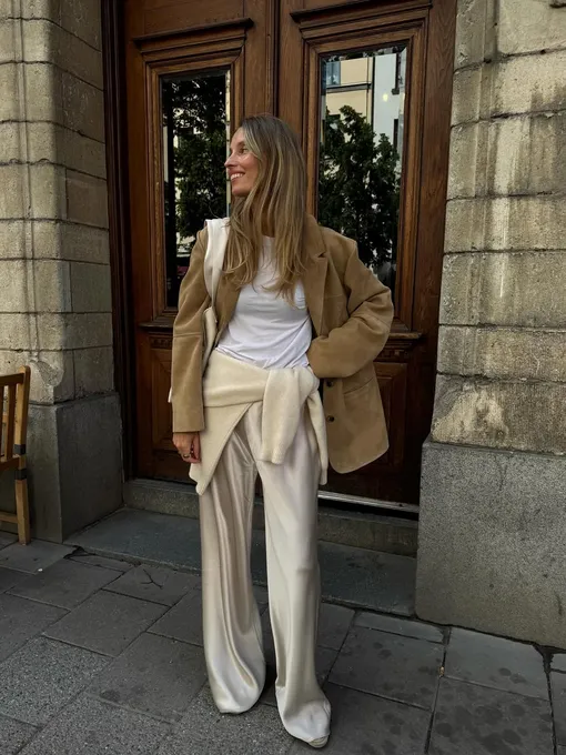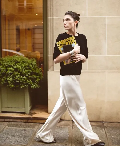 Цвет задает тон всему образу. В теплый сезон лучше работают светлые и мягкие оттенки: белый, сливочный, бежевый, небесно-голубой или миллениальский розовый. Они подчеркивают фактуру и не перегружают образ. Темные варианты (черный, шоколадный или глубокий синий) смотрятся более строго и подходят для вечерних выходов. С яркими оттенками стоит быть аккуратнее: насыщенный тон в сочетании с сиянием материала может визуально «утяжелить» восприятие. Стилизовать такие брюки проще, чем кажется. Днем носите их с майкой, лонгсливом с кружевом или рубашкой. На талию можно повязать джемпер: и силуэт подчеркнете, и сможете использовать его по назначению, если станет прохладно. А сверху накиньте тренч, кожаную куртку или ветровку. Обувь — сандалии, мюли или лоферы. Вечером добавьте жакет и кружевной топ, а плоский ход замените на каблуки. Самые красивые опции перед вами.