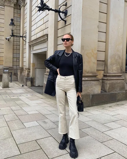Носить светлые джинсы можно совершенно тем же способом, что и обычные. Если боитесь испачкать их во время весенней прогулки, просто сочетайте с высокими сапогами на шнуровке, казаками или длинными сапогами — шанс забрызгать их сзади водой из луж сводится к нулю. Попробуйте, например, создать монохромный образ из бежевых джинсов, оверсайз-жакета в песочном цвете, белого топа и классического тренча. Получится стильный образ в парижском стиле.