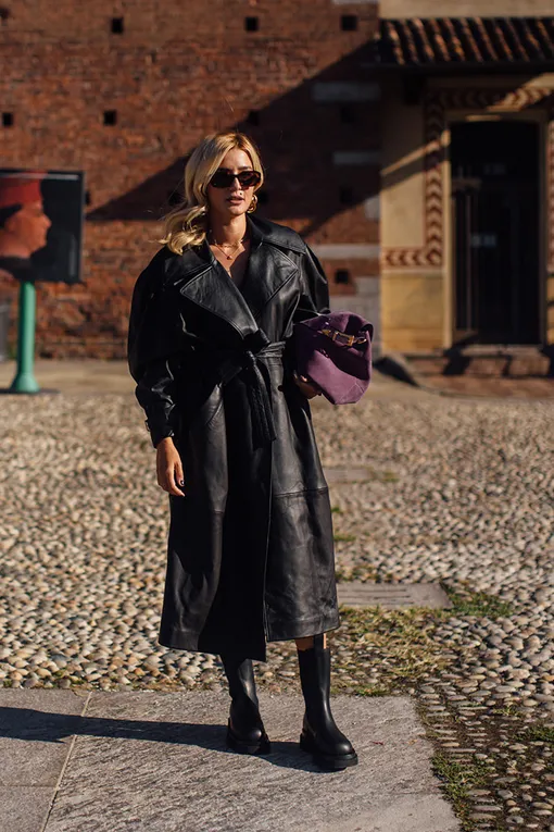 Носить кожаные плащи можно разными способами. Сами собой просятся образы в духе «Матрицы»: узкие очки, облегающие боди, латексные джинсы-скинни. Если для вас это слишком эпатажно, не отчаивайтесь, кожаный тренч хорошо подойдет и к более привычным аутфитам. Например, он хорошо будет смотреться с повседневными широкими брюками и жакетами, которые помогут создать многослойный лук. Или же смело надевайте плащ с платьем — например, с комбинацией, которая добавит образу романтичности.