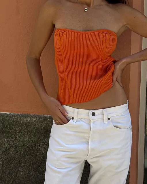 Яркий оттенок добавит красок даже монохромному луку, а ткань в рубчик поможет разнообразить фактуры, из которых состоит образ. В сочетании с юбкой или брюками из гладкой ткани такой топ будет смотреться гораздо интереснее простой майки-алкоголички. При этом в прохладную погоду на плечи можно будет накинуть жакет или джемпер. Отлично будет смотреться такой топ и с трендовыми брюками карго, и с минималистичной шелковой юбкой макси, и даже с ультракороткими джинсовыми шортами. А в нашей подборке мы собрали опции, которые помогут вам составить образы на все лето.