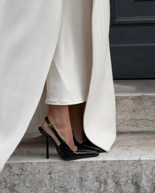 Не менее полезным приобретением окажутся туфли слингбэки с острыми носами. Эта модель с открытой пяткой и элегантным ремешком держится в списке главных трендов уже не первый год и не планирует сдавать позиций и в следующем сезоне. Такая пара здорово дополнит платье любой длины и фасона, юбку в пайетках и даже смокинг. Так то вне зависимости от того, в чем вы планируете пойти на корпоратив, не сомневайтесь — слингбэки идеально дополнят ваш образ. А помимо опций на высокой шпильке, советуем присмотреться и к более удобным моделям на kitten-heel. Они будут выглядеть так же элегантно, но при этом не вызовут дискомфорта в носке.