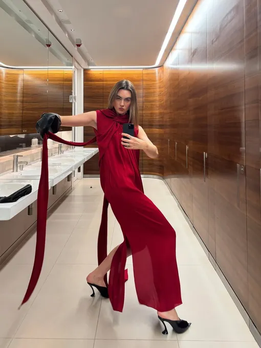 Почему именно эта расцветка? Несмотря на то что мода давно вышла за рамки суеверий, в новогоднюю ночь особенно хочется добавить луку немного символизма. Ведь это время обновления: и каждая деталь кажется значимой. По восточному календарю нас ждет год Огненной Лошади — сильной, темпераментной, свободолюбивой. И именно красный становится цветом-талисманом. В традициях фэншуй он символизирует процветание, уверенность и успех. Но выбрать его стоит не только ради астрологических прогнозов. Красный — один из главных трендов текущего сезона, и сдавать позиции он точно не собирается. Значит, платье станет не «разовой акцией», а впишется в вашу вечернюю капсулу. А в брендах представлено достаточно фасонов, чтобы подобрать под свой вкус, запрос и тип фигуры. Самый очевидный вариант — пайетки. Мелкие или крупные, они гарантируют праздничное «сияние» и идеальны для корпоративов и вечеринок. Еще один актуальный путь — материалы. Бархатные версии делают оттенок более глубоким, а кожа придает дерзкий современный характер. Такие опции не требуют сложной стилизации: достаточно трендовой пары на танкетке и минималистичных украшений. Если вы предпочитаете универсальность, обратите внимание на платье-комбинацию. После вы сможете стилизовать его с жакетом на свидание или в театр.
