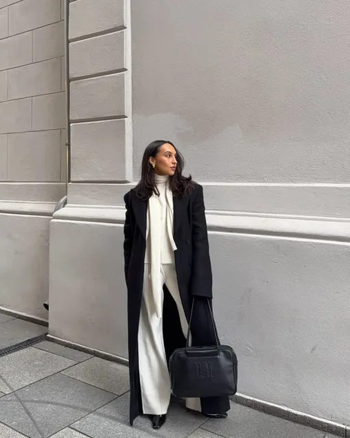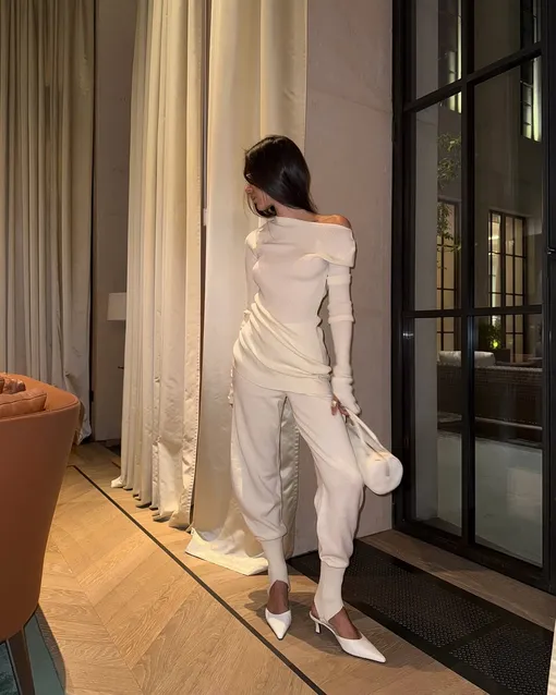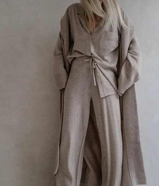 Трикотаж может быть разным: лаконичным, в косичку или рубчик, но ключевую роль играет состав материала. При выборе обратите внимание на изделия с высоким содержанием натуральных волокон. Если это не стопроцентный кашемир, то желательно, чтобы в составе было не менее 60%. Чем выше процент кашемира, тем лучше качество изделия. Кашемир нередко сочетают с другими материалами, и наиболее удачным вариантом считается смесь с шерстью или хлопком. К сожалению, из-за сложности производства настоящий кашемир отличается высокой ценой. Но его преимущества очевидны: ткань в несколько раз теплее обычной шерсти, невероятно легкая и гипоаллергенная, что делает ее отличным выбором для зимнего гардероба. Теперь давайте остановимся на фасоне. Самый универсальный вариант — джемпер + брюки. Также достойной альтернативой станут комплекты с толстовками и джоггерами, которые прекрасно впишутся в повседневную капсулу. Сам «верх» может быть с высоким воротом, на молнии или в виде поло. Что касается кроя, оверсайз-костюмы обеспечат максимальное удобство, но важно, чтобы они держали форму и подчеркивали фигуру, а не выглядели мешковато. Иначе образ будет немного небрежным.