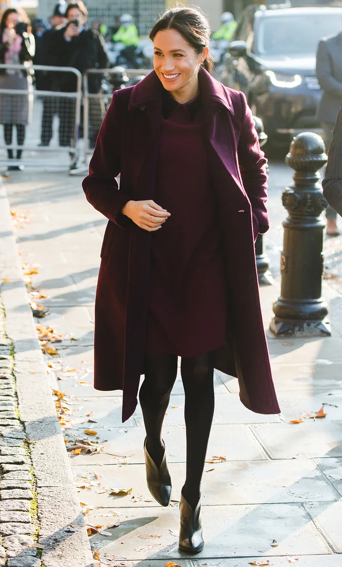 На днях Меган Маркл посетила сообщество Hubb Community Kitchen и произвела фурор в пальто и коротком платье в сложном винном оттенке. Монохромные образы и глубокие цвета сейчас на пике моды, поэтому мы предлагаем последовать удачному примеру герцогини Сассекской и подобрать для себя верхнюю одежду в похожей гамме.