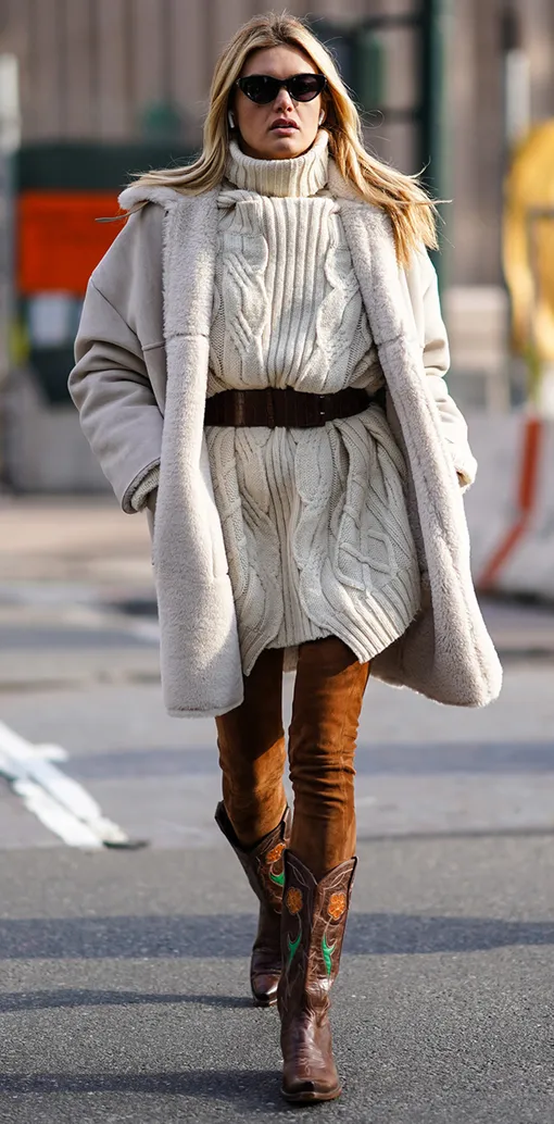 Теплое платье — это просто необходимая покупка в зимний сезон. Не стоит ограничивать себя только облегающими моделями из тонкого трикотажа, популярными в этом сезоне, ведь есть вариант куда более удобный — плотное шерстяное платье-свитер. Его можно сочетать с фактурными колготками, прямыми брюками и даже попавшими в модную немилость джинсами-скинни — в таком сочетании они совсем не выглядят устаревшими или немодными. Наконец, платье-свитер — это идеальная вещь для того, чтобы создать многослойный образ. Если же вы хотите носить его как самодостаточный аутфит, компенсировать длину можно высокими сапогами, ботиками на шнуровке или даже ботфортами.