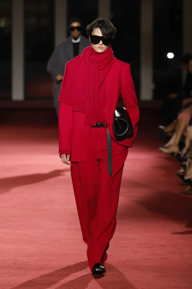 Почему именно красные и почему именно брюки? Несмотря на активный цветовой тренд, не каждый яркий оттенок легко адаптируется. Желтые или оранжевые варианты требуют сложной стилизации (и не каждому приходятся по душе), тогда как красный удивительно гибок, и идет всем. Он сохраняет выразительность, но при этом легко сочетается с базовой палитрой. Красный традиционно ассоциируется с уверенностью, энергией и внутренней силой — и эта эмоциональная составляющая заметно влияет на восприятие образа. Даже одна такая вещь способна задать нужный тон. Брюки остаются самой практичной частью гардероба, и сейчас актуальны самые разные формы: брюки-клеш, широкие, зауженные или баллоны. Отдельного внимания заслуживает заниженная посадка, которая возвращается как часть общего интереса к эстетике нулевых. Но самое универсальное решение — прямые пары на средней или завышенной талии. Материалы также разнообразны: костюмная шерсть, смесовые ткани, кожа (и ее альтернативы) или мягкий трикотаж.