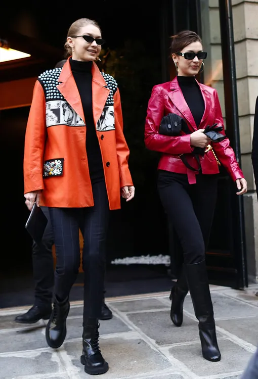 Сестры синхронно облачились в яркие power jackets для прогулки по весеннему Парижу: Белла выбрала приталенную модель цвета сочной фуксии в сочетании с узкими брюками и сапогами на высоком каблуке, а Джиджи предпочла более «мальчишеский» образ из свободного жакета цвета сочного мандарина с объемной вышивкой и удобные ботинки на платформе. А если вы хотите повторить образ звезд стритстайла, то добро пожаловать в нашу подборку.