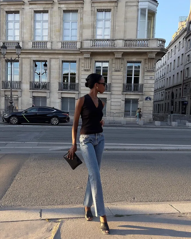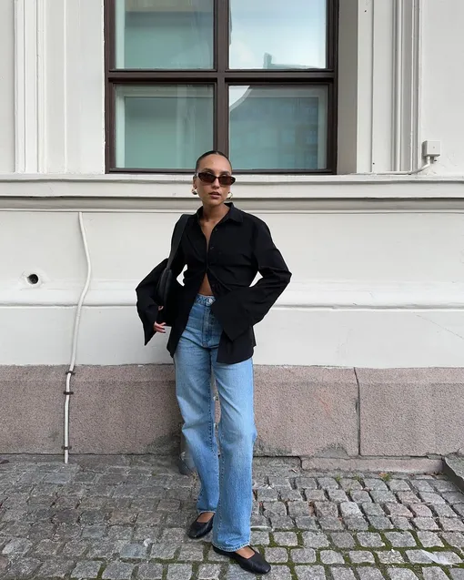 В этом сезоне модные инфлюенсеры доказывают, что нет ничего более эффектного, чем базовые предметы гардероба. Но главное — уметь использовать некоторые стилистические уловки. Просматривая социальные сети, мы заметили, что этой весной героини стритстайла сделали ставку на голубой деним и черные топы. Это сочетание легко может стать новой униформой. Безусловно, это может показаться не самой захватывающей комбинацией, но она проверенная и вневременная. Это особенно актуально в эпоху осознанного потребления, когда мы все стремимся внимательнее подходить к шопингу. Что выбрать в качестве низа? Конечно, ваши любимые голубые джинсы. Самый универсальный вариант — прямые модели на средней или высокой посадке. Но вы можете также использовать любые голубые пары, которые хорошо на вас сидят. Например, клеш, мешковатые, bootcut или карго. Последние, кстати, все еще в тренде в этом сезоне. А вот верх может быть любым. Рубашка, блуза, футболка, майка-алкоголичка или нарядный топ — ориентируйтесь на личные предпочтения и повод.