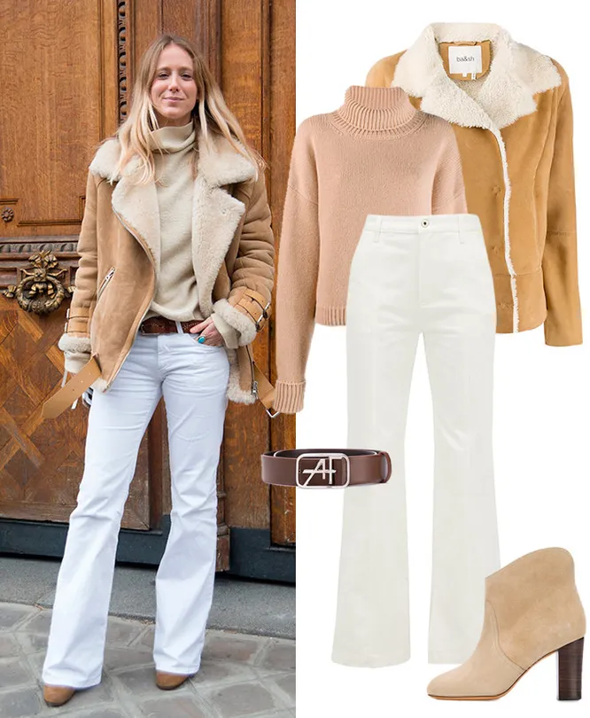 Джемпер MAISON MARGIELA, 35 847 руб.; джинсы LOEWE, 29 832 руб.; дубленка BA&SH, 99 874 руб.; ремень ALBERTA FERRETTI, 23 705 руб.; ботильоны TILA MARCH, 16 954 руб.