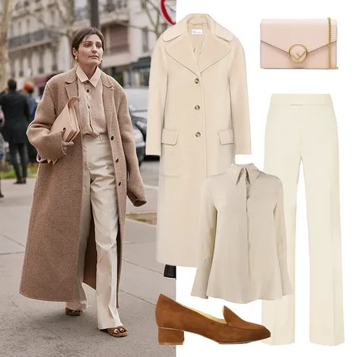 Блузка ERIKA CAVALLINI, 23 155 руб.; брюки JOSEPH, 26 037 руб.; пальто REDVALENTINO, 44 106 руб.; сумка FENDI, 74 900 руб.; лоферы SARAH FLINT, 22 161 руб.
