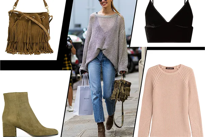 1. Джемпер, Iris Von Arnim. 2. Джинсы, Rag & Bone. 3. Топ, T by Alexander Wang. 4. Очки, Ray-Ban. 5. Ботильоны, Gianvito Rossi. 6. Сумка, Saint Laurent.