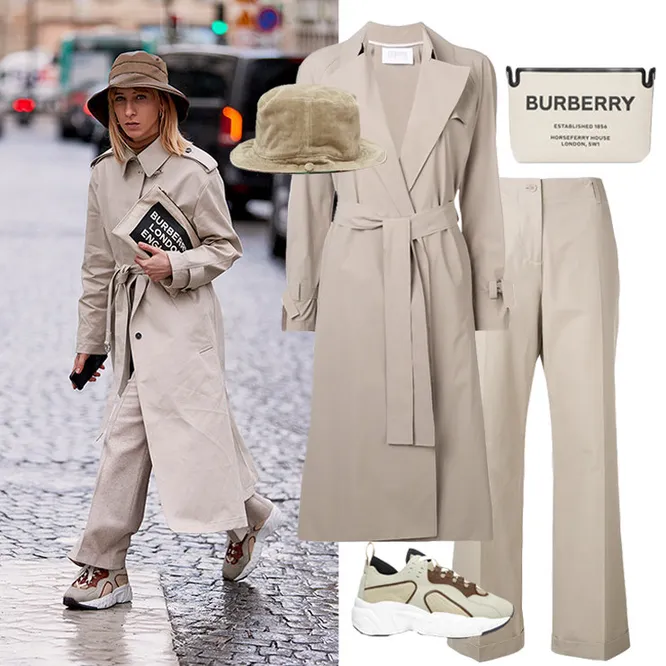 Тренч HARRIS WHARF LONDON, 18 398 руб.; брюки ASPESI, 9 806 руб.; клатч BURBERRY, 46 904 руб.; панама GUCCI, 19 708 руб.; кроссовки ACNE STUDIOS, 25 068 руб.