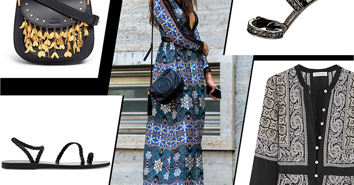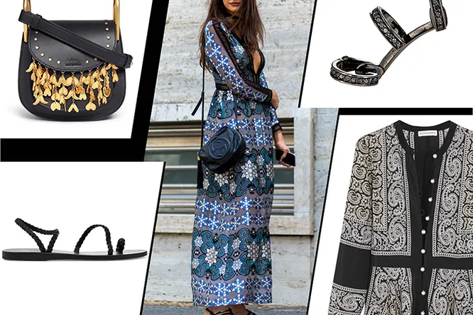 1. Платье, Altuzarra [https://www.net-a-porter.com/fr/en/product/747630/altuzarra/winne-asymmetric-paisley-print-silk-maxi-dress]. 2. Серьга-кафф, Repossi [http://www.barneys.com/product/Repossi-Berb%C3%A8re-Monotype-3-Loop-Ear-Cuff-504738133.html]. 3. Сумка, Chloe [https://www.lanecrawford.com/product/chlo/-hudson-mini-heart-charm-leather-saddle-bag/_/HHQ240/product.lc]. 4. Браслет, Kimberly McDonald [https://www.net-a-porter.com/fr/en/product/678574/kimberly_mcdonald/18-karat-blackened-white-gold--quartz-and-diamond-bracelet]. 5. Сандалии, Ancient Greek Sandals [https://www.net-a-porter.com/fr/en/product/714046/ancient_greek_sandals/eleftheria-braided-leather-sandals].