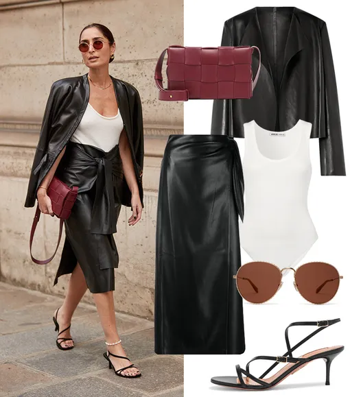 Жакет THE ROW, 260 121 руб.; юбка NANUSHKA, 24 413 руб.; боди AGOLDE, 4 299 руб.; сумка BOTTEGA VENETA, 103 666 руб.; босоножки AQUAZZURA, 32 564 руб.; очки GIVENCHY, 14 724 руб.
