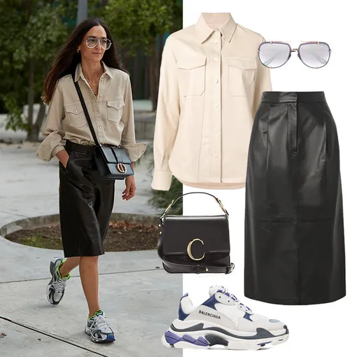 Блузка CALVIN KLEIN, 2 860 руб.; юбка TIBI, 30 693 руб.; очки DITA EYEWEAR, 30 263 руб.; сумка CHLOÉ, 87 972 руб.; кроссовки BALENCIAGA, 64 000 руб.