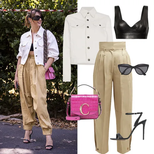 Топ ALAÏA, 135 193 руб.; брюки GIVENCHY, 56 976 руб.; куртка CALVIN KLEIN 205W39NYC, 40 659 руб.; сумка CHLOÉ, 90 852 руб.; туфли THE SELLER, 10 373 руб.; очки GUCCI EYEWEAR, 20 886 руб.