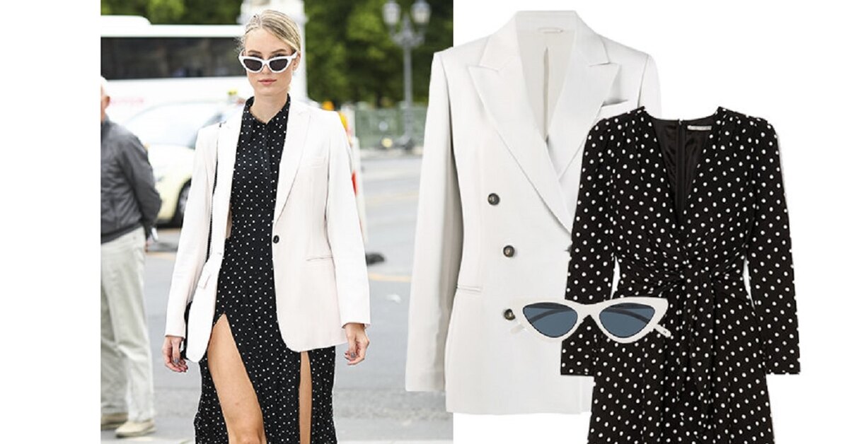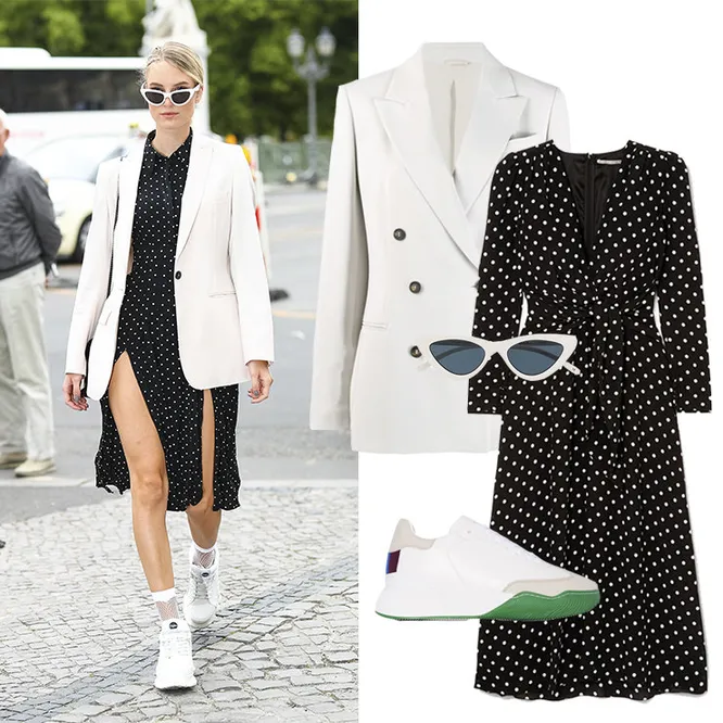 Платье ALESSANDRA RICH, 86 948 руб.; блейзер BRUNELLO CUCINELLI, 288 500 руб.; очки LE SPECS, 8 511 руб.; кроссовки STELLA MCCARTNEY, 29 464 руб.