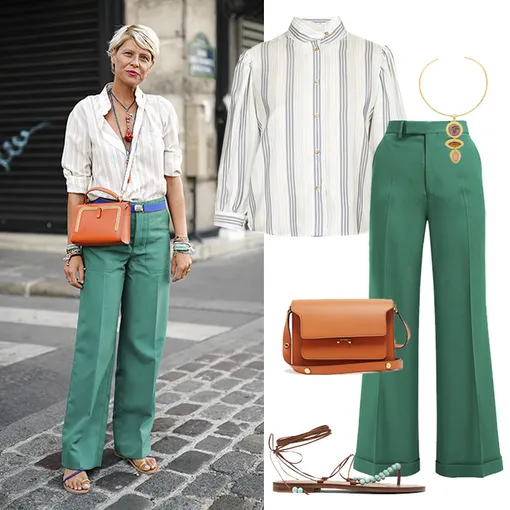 Рубашка LOEWE [https://www.matchesfashion.com/intl/products/Loewe-High-neck-striped-poplin-blouse-1281306], 43 762 руб.; брюки GUCCI [https://www.matchesfashion.com/intl/products/Gucci-Kick-flared-wool-trousers-1272375], 67 912 руб.; колье SYLVIA TOLEDANO [https://www.matchesfashion.com/intl/products/Sylvia-Toledano-Multi-stone-rhodonite-and-rose-quartz-choker-1303886], 21 222 руб.; сумка MARNI [https://www.matchesfashion.com/intl/products/Marni-Trunk-medium-leather-shoulder-bag-1280317], 97 404 руб.; сандалии ÁLVARO [https://www.matchesfashion.com/intl/products/%C3%81lvaro-X-Kim-Hersov-Kaiah-beaded-leather-sandals-1300385], 26 272 руб.