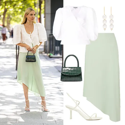 Блузка GANNI, 7 387 руб.; юбка LES HÉROÏNES BY VANESSA COCCHIARO, 12 677 руб.; сережки MIZUKI, 47 388 руб.; туфли THE ROW, 49 202 руб.; сумка BY FAR, 26 957 руб.
