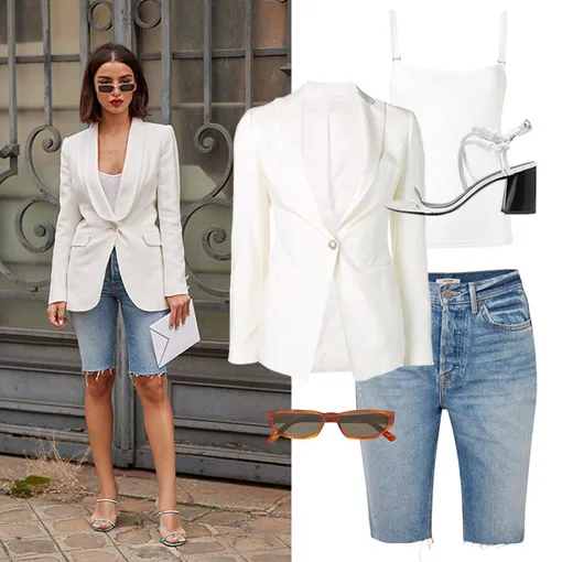 Блейзер TAGLIATORE, 33 612 руб.; шорты GRLFRND, 5 104 руб.; майка DION LEE, 6 821 руб.; туфли 3.1 PHILLIP LIM, 19 299 руб.; очки ANDY WOLF, 21 293 руб.