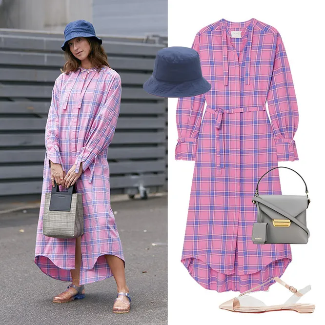 Платье MUNTHE, 14 705 руб.; панама KANGOL, 3 120 руб.; сумка PRADA, 119 577 руб.; сандалии CHRISTIAN LOUBOUTIN, 37 532 руб.