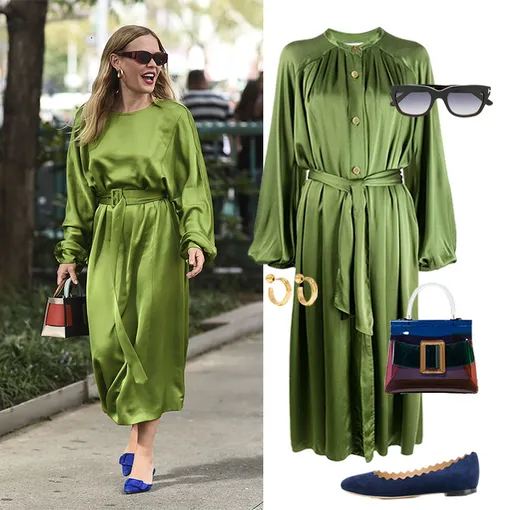 Платье FORTE FORTE, 66 521 руб.; очки TOM FORD EYEWEAR, 19 023 руб.; серёжки SOPHIE BUHAI, 18 219 руб.; сумка BOYY, 49 219 руб.; балетки CHLOÉ, 26 002 руб.