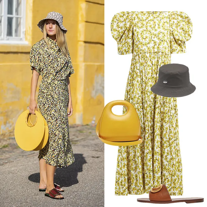 Платье RHODE [https://www.matchesfashion.com/intl/products/RHODE-Aurora-floral-print-tiered-cotton-dress-1280163], 29 502 руб.; панама KANGOL, 2 905 руб.; сумка LEMAIRE [https://www.matchesfashion.com/intl/products/Lemaire-Egg-smooth-leather-bag-1254036], 114 889 руб.; сандалии VALENTINO [https://www.net-a-porter.com/ru/en/product/1132561/valentino/valentino-garavani-go-logo-embellished-pvc-slides], 32 102 руб.