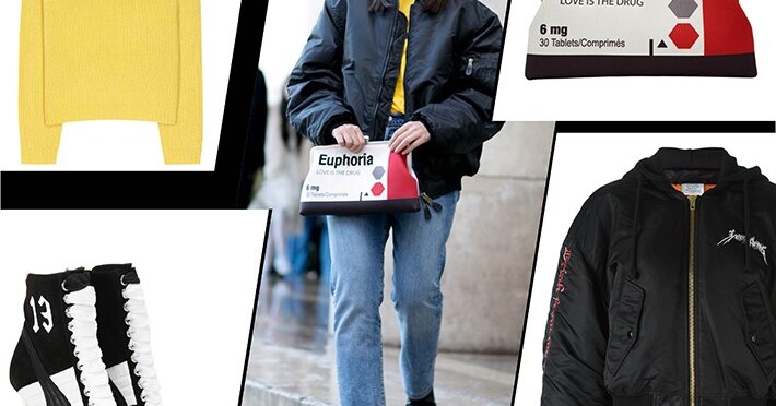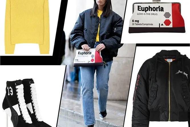 1. Бомбер, Vetements [https://www.farfetch.com/uk/shopping/women/vetements-embroidered-bomber-jacket-item-11589921.aspx?storeid=9702&size=20&utm_source=Hy3bqNL2jtQ&utm_medium=affiliate&utm_campaign=Linkshareuk&utm_content=10&utm_term=UKNetwork]. 2. Очки, Celine [https://www.farfetch.com/uk/shopping/women/celine-eyewear--baby-audrey-sunglasses-item-11723158.aspx?storeid=10144&size=17&utm_source=Hy3bqNL2jtQ&utm_medium=affiliate&utm_campaign=Linkshareuk&utm_content=10&utm_term=UKNetwork]. 3. Джемпер, Acne Studios [http://www.mytheresa.com/int_en/saidy-wool-sweater-654928.html?utm_source=affiliate&utm_medium=affiliate.cj.int]. 4. Клатч, Euphoria. 5. Джинсы, Helmut Lang [http://www.matchesfashion.com/products/1056040?country=GBR&qxjkl=tsid:30065%7Ccgn:Hy3bqNL2jtQ&c3ch=LinkShare&c3nid=Hy3bqNL2jtQ&utm_source=linkshare&utm_medium=affiliation&utm_campaign=uk&utm_content=Hy3bqNL2jtQ]. 6. Ботильоны, Puma Fenty by Rihanna [http://www.mytheresa.com/int_en/suede-sneaker-style-ankle-boots-678497.html?utm_source=affiliate&utm_medium=affiliate.cj.int].