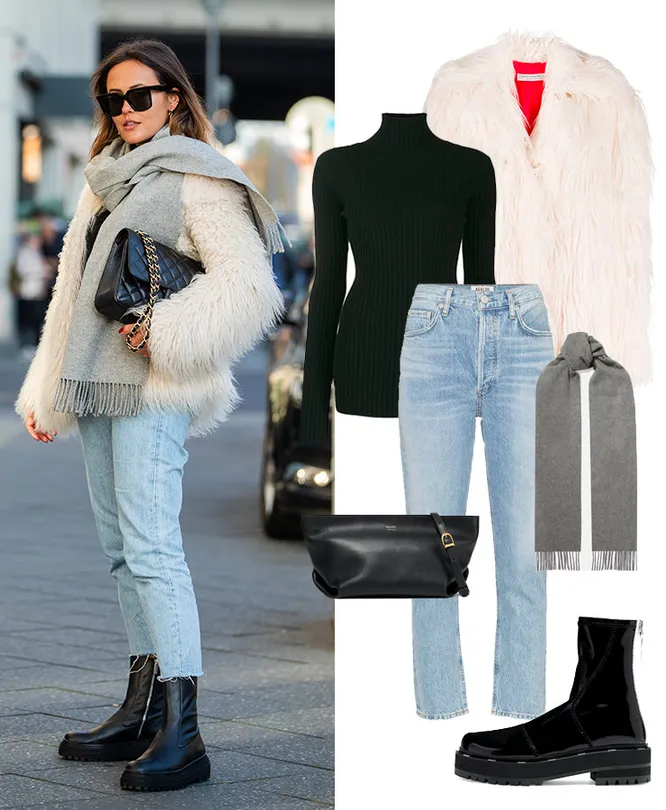 Водолазка MM6 MAISON MARGIELA, 33 402 руб.; джинсы AGOLDE, 12 898 руб.; шуба PHILOSOPHY DI LORENZO SERAFINI, 35 246 руб.; шарф JOHNSTONS OF ELGIN, 8 035 руб.; сумка KHAITE, 57 837 руб.; ботинки FENDI, 48 127 руб.